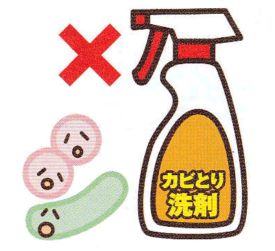 カビ取り剤は浄化槽で汚水を元気に食べる微生物を殺してしまいますので、使用は控えめに。また、使用後は十分に水で洗い流して下さい。